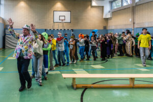 sich die Turnhalle der Pestalozzi-Mittelschule in ein buntes und fröhliches Faschingsparadies. Die Schüler kamen in einer Vielzahl von kreativen und einfallsreichen Kostümen, die die Fantasie und den Spaß dieser besonderen Zeit des Jahres widerspiegelten. Nach der Pause füllte sich die Turnhalle mit strahlenden Gesichtern, während die Schüler stolz ihre Kostüme präsentierten. Von klassischen Clowns über fantasievolle Märchenfiguren bis hin zu mutigen Superhelden – die Vielfalt der Verkleidungen war beeindruckend. Besonders hervorzuheben sind die fünf besten Kostüme, die von einer Jury ausgezeichnet wurden. Diese Schüler zeigten nicht nur ein großes Maß an Kreativität, sondern auch den Mut, ihre individuellen Persönlichkeiten durch ihre Kostüme zum Ausdruck zu bringen. Neben den Kostümen gab es auch einen Wettbewerb für die besten Witze. Die Schüler hatten im Vorfeld ihre besten Scherze eingereicht, und die fünf besten Witze wurden während der Feier prämiert. Lachen ist eine wichtige Komponente des Faschings, und die humorvollen Beiträge sorgten für viele herzliche Lacher und eine fröhliche Atmosphäre. Unter der Leitung von Rektor Herrn Stumpf setzte sich dann der Gaudiwurm in Bewegung. Die Schüler zogen fröhlich durch die Turnhalle, vorbei an der Schokokussstation, wo sie sich mit süßen Leckereien stärken konnten. Nach dem fröhlichen Umzug kehrten die Kinder in ihre Klassenzimmer zurück, wo sie gespannt auf ihre Zeugnisse warteten. Insgesamt war die Faschingsfeier an der Pestalozzi-Mittelschule ein voller Erfolg. Die bunten Kostüme, die lustigen Witze und die fröhliche Stimmung werden allen Beteiligten noch lange in Erinnerung bleiben. Wir freuen uns schon auf das nächste Jahr! Danke auch den beiden Kolleginnen Frau Hess und Frau Weckesser, die mit Liebe und Kreativität dieses Gemeinschaftserlebnis erst ermöglichten. Und jetzt allen ein SUPER HELAU und schöne Faschingsferien.